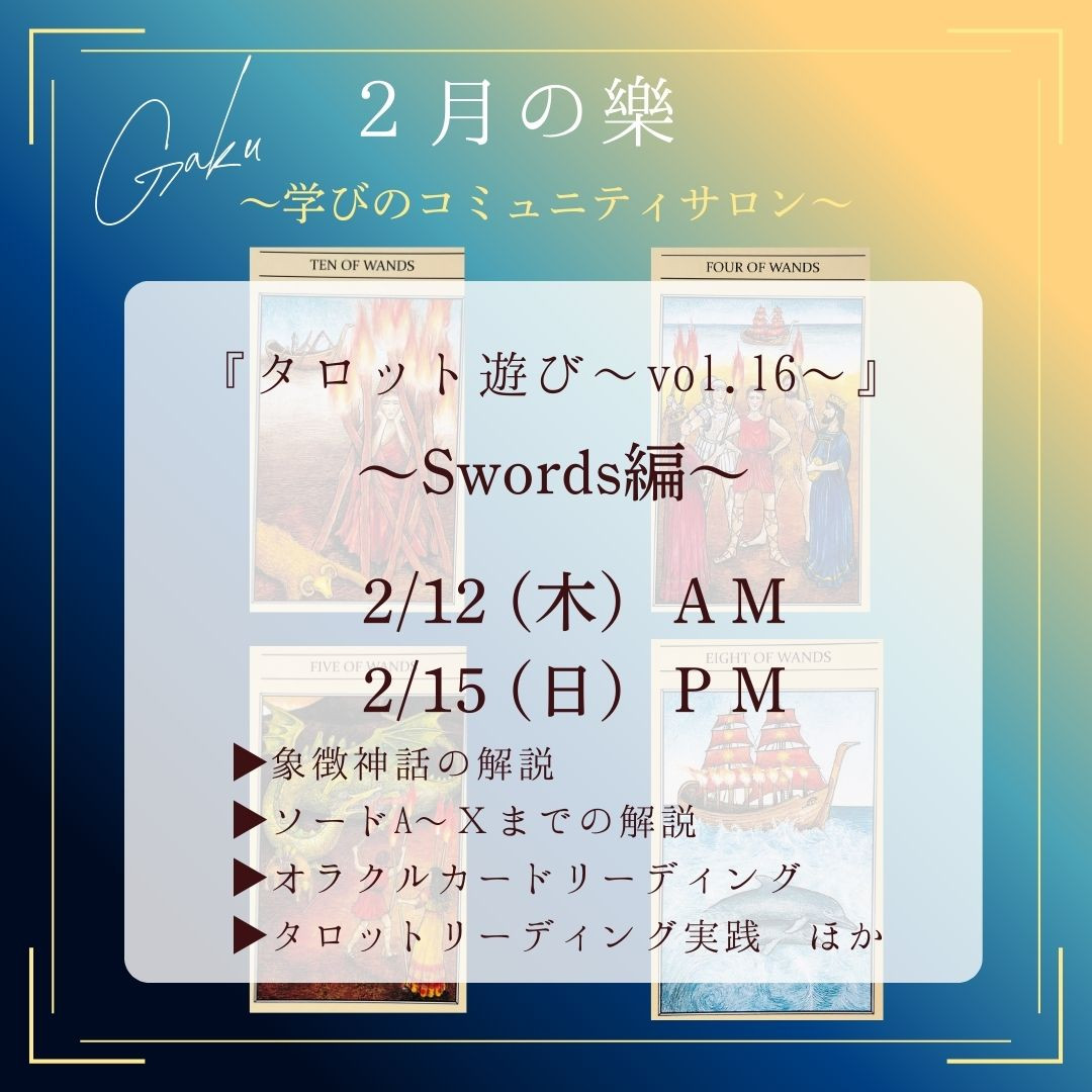 次回の樂gakuは、『タロット遊び(小アルカナ編)〜vol.16』です。