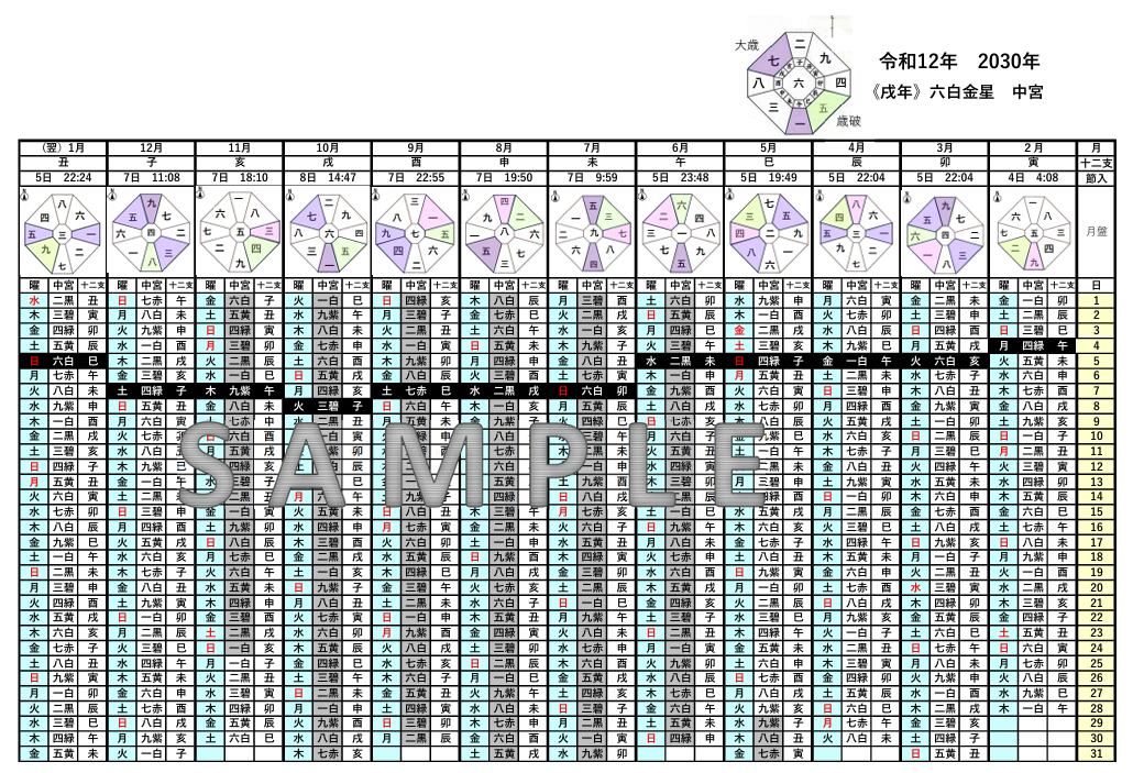 ◆2026年~2040年の15年分の方位カレンダー(年盤・月盤・日盤一覧)を販売させていただきます